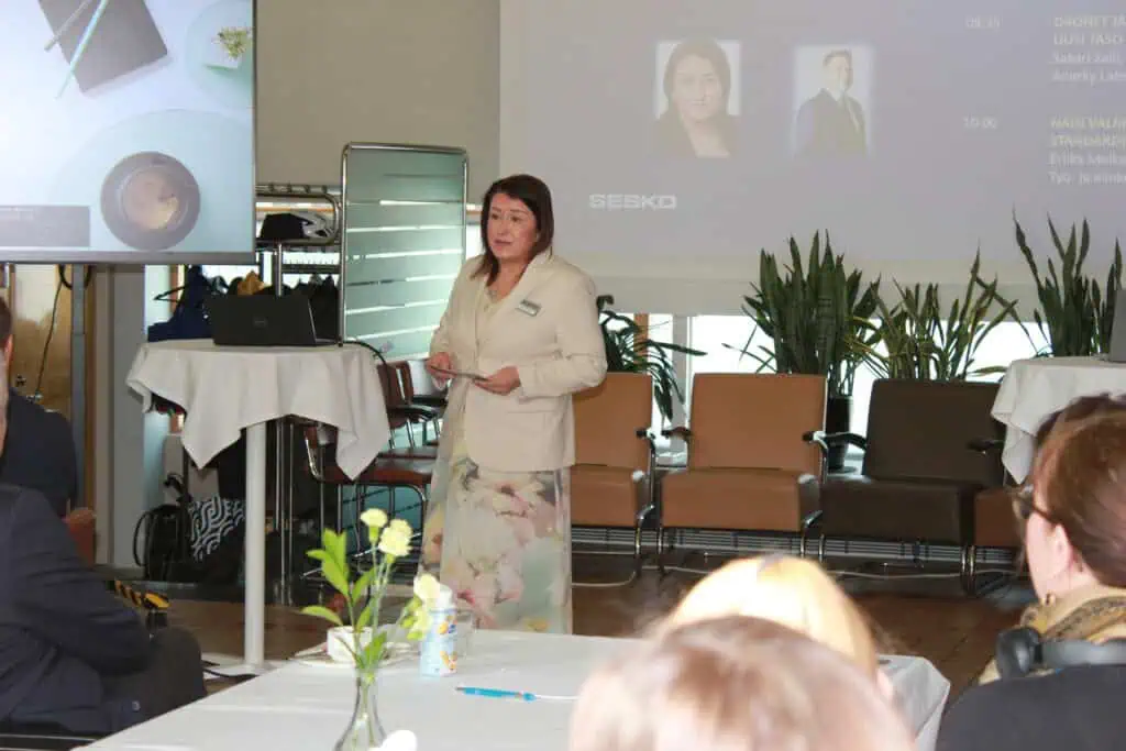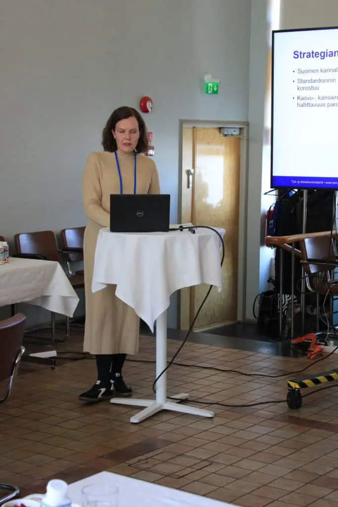Tilaisuuden viimeinen puhuja oli Eriika Melkas työ- ja elinkeinoministeriöstä, joka esitteli valmistelussa olevaa kansallista standardointistrategiaa. Strategian tavoitteena on tunnistaa Suomelle keskeiset painopistealueet ja vahvistaa standardoinnin roolia kilpailukyvyn, innovaatioiden ja viennin tukena.