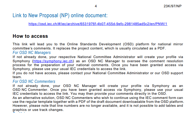 IEC-työryhmien jäsenet törmäävät OSD:llä laadittaviin standardiehdotuksiin työryhmissä (WG) ja standardien ylläpitoryhmissä (MT), kun uusia projekteja käynnistetään tai kun IEC-standardien uusia painoksia laaditaan. Tällöin ei tarvitse enää temppuilla erilaisten ja erinäköisten word-tiedostojen kanssa, vaan viimeisin ehdotusversio on jatkuvasti nähtävissä työryhmän jäsenten yhteisellä alustalla. Ehdotusten kommentointi on varsin selkeää ja yksinkertaiset ohjeet löytyvät IEC:n verkkosivulta https://iec.helpscoutdocs.com/article/55-provide-comments-in-osd . Työryhmien vetäjät antavat tarvittaessa lisäohjeita oman työryhmänsä jäsenille siitä, miten työryhmässä sovelletaan uutta palvelua.
