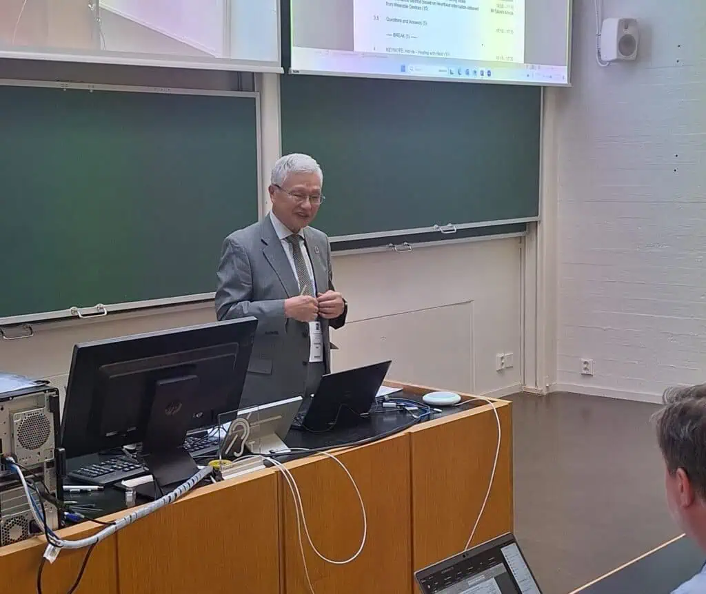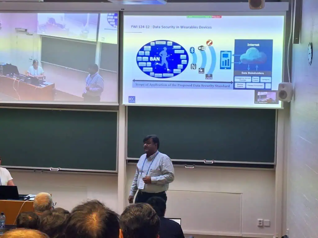 Deok-kee Kim kertoi työryhmän 4 laitteista ja järjestelmistä. Teknisen komitean TC124 työryhmä WG4 (Wearable Electronic Devices and Technologies) kokoontuu 6. kesäkuuta 2024 Espoon Otaniemessä. Työryhmän WG4 Convenorina toimii Deok-kee Kim ja Assistant Convenorina Veronica Lancaster. Seminaarissa korostettiin työryhmän tavoitteita kehittää mittaus- ja arviointimenetelmiä puettaville elektronisille laitteille ja järjestelmille, erityisesti implantteja, laastareita ja nieltäviä laitteita varten. Lisäksi keskityttiin järjestelmien, sovellusten ja palveluiden standardointiin.